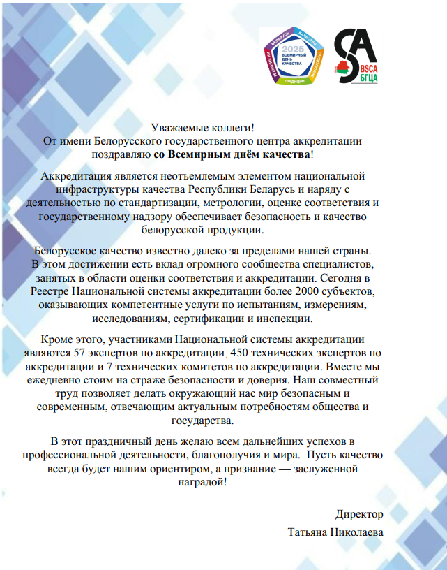 Поздравление со Всемирным днем качества от руководителя Государственного предприятия "БГЦА"